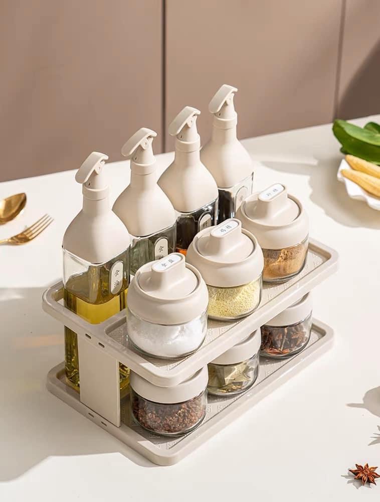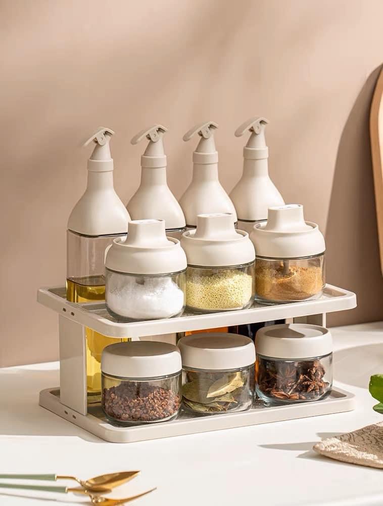 Bộ Hũ Đựng Gia Vị, Chai Đựng Dầu Ăn Kèm Kệ Cao Cấp