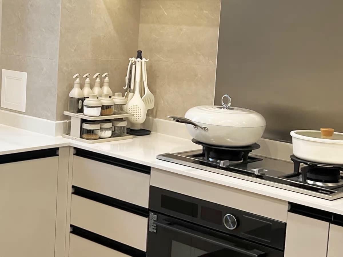 - Thiết kế tinh tế, phần nắp có gắng muỗng sẵn, gam màu đen trắng làm nổi bật vẻ hiện đại cho căn bếp