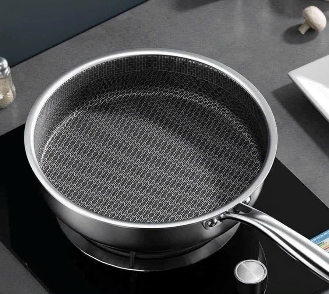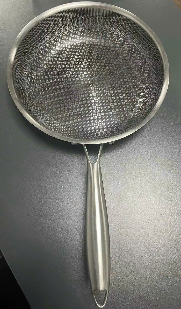 Chảo chống dính 5 lớp inox 304 công nghệ khắc laser tổ ong sz 28 đáy bằng chuyên dùng để áp chảo, chiên rán. Chảo 5 lớp nên khi rán không bị phồng đáy, đế bằng bên bắt từ cực tốt!