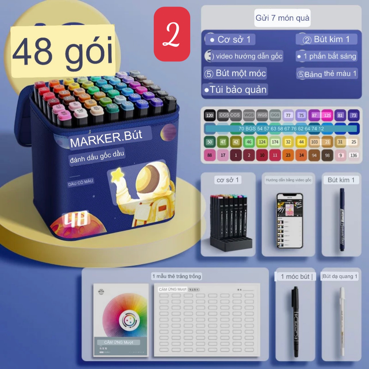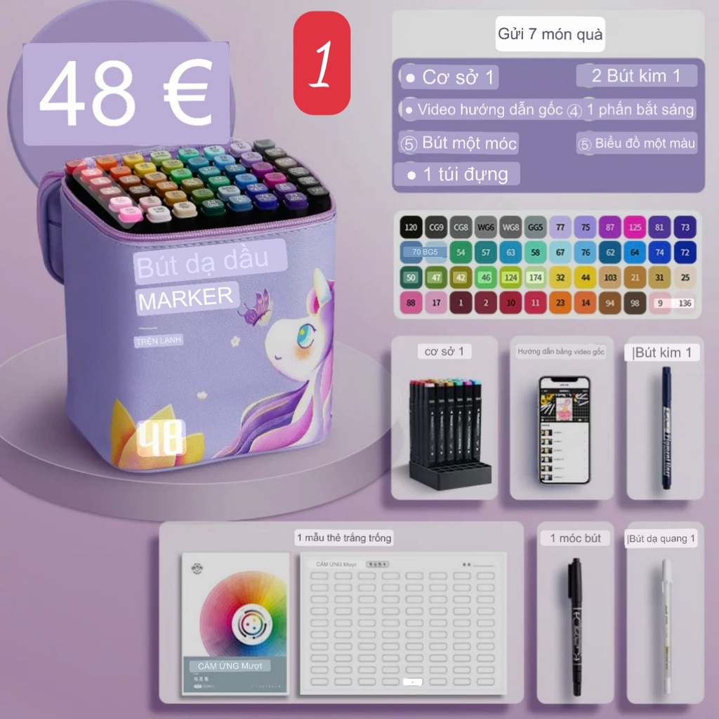 👉🏻1 set gồm: 24 màu hoặc 48 bút màu Maker + 6 quà (1 túi đựng chất lượng cao, 1 khay để bút, 1 bút đầu kim, 1 bút đánh dấu, 1 bút line, 1 bảng màu trống)