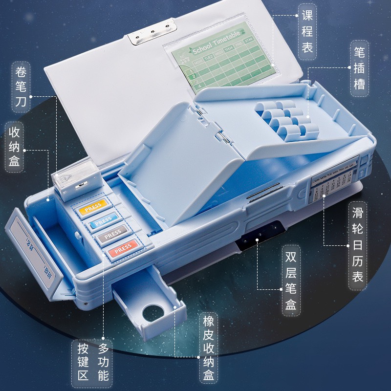 Hộp bút nhỏ gọn mà có sức chứa lớn, có ngăn đựng kéo, tẩy, gọt bút, thước, băng dính riêng rất tiện lợi và ngăn nắp.