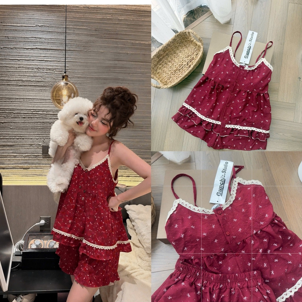 🌈Một chút đỏ rượu ấm áp, một chút ren trắng dịu dàng – tất cả tạo nên một set đồ vừa ngọt ngào vừa tinh tế. Chất vải mềm, thoáng, mặc cực kỳ dễ chịu, dù ở nhà hay đi ngủ đều xinh xắn hết nấc 🥰