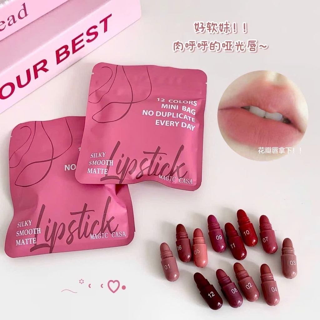 💄 Giờ chị em nào thích thử nhiều màu son như em thì rinh ngay Set son mini Magic Casa – 12 màu T25092607 trong 1 túi này điiii. #109kkkk/ 12 màu