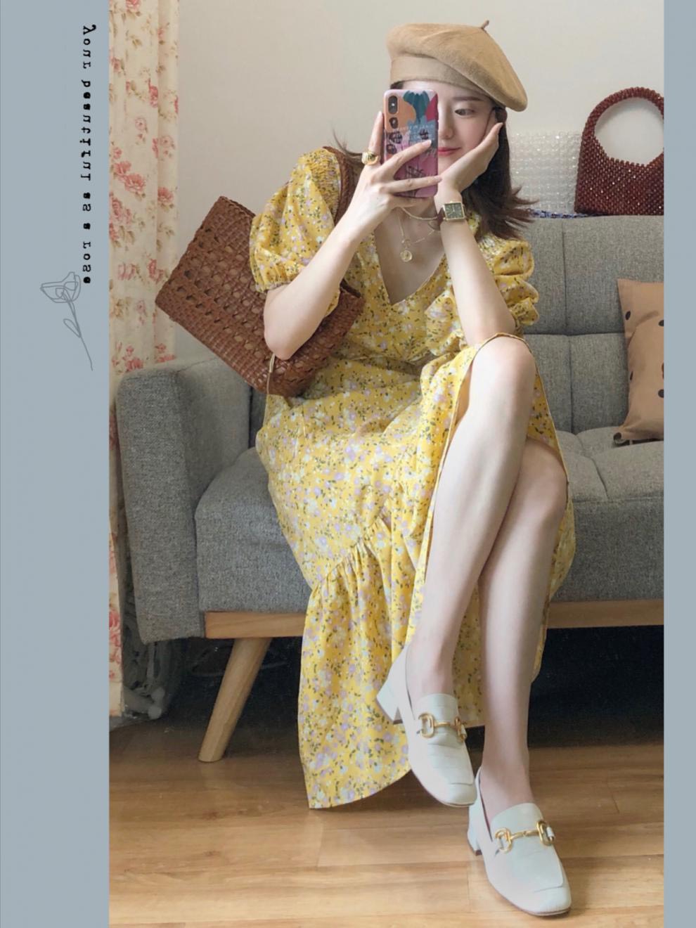 Thiết kế cổ V tay -tay bồng - Ống tay rộng chun che bắp tay 💕 Dưới xuông A xoè nhẹ phần đuôi cá nên dáng váy cực xinh.